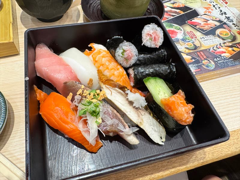 ネタは中トロ、かんぱち、まぐろ、トロサーモン、えんがわ、いか、赤海老、ネギトロ軍艦、生雲丹軍艦、真鯛となっていました。