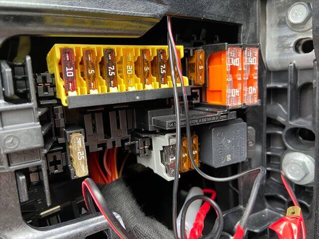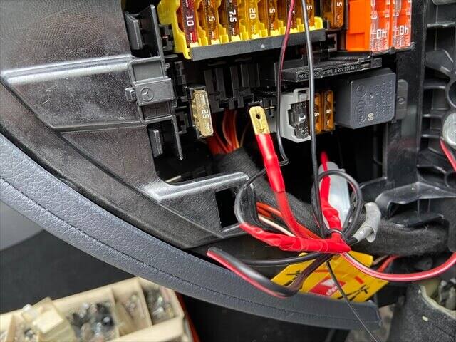 アクセサリー電源はこのヒューズのすぐ下にあるソケットから取ることができるので、こちらにちょうど持っていた端子を差し込んでプラス電源を確保しました。