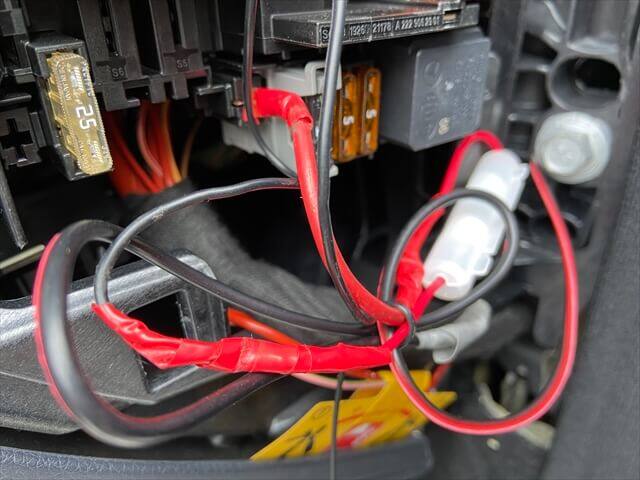 エーモンの平型ヒューズ電源にはヒューズが付いていましたので、取り出した端子とレーダー探知機の間にヒューズを入れておきました。