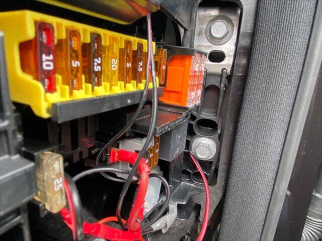 マイナスアースはどこで取れるかなと思い、ヒューズボックス内にあったボルトで下側の場所にあるボルトからボディアースが取れることがわかりましたので、こちらのボルトを緩めて配線を巻き付け、再度締めなおして完成です。