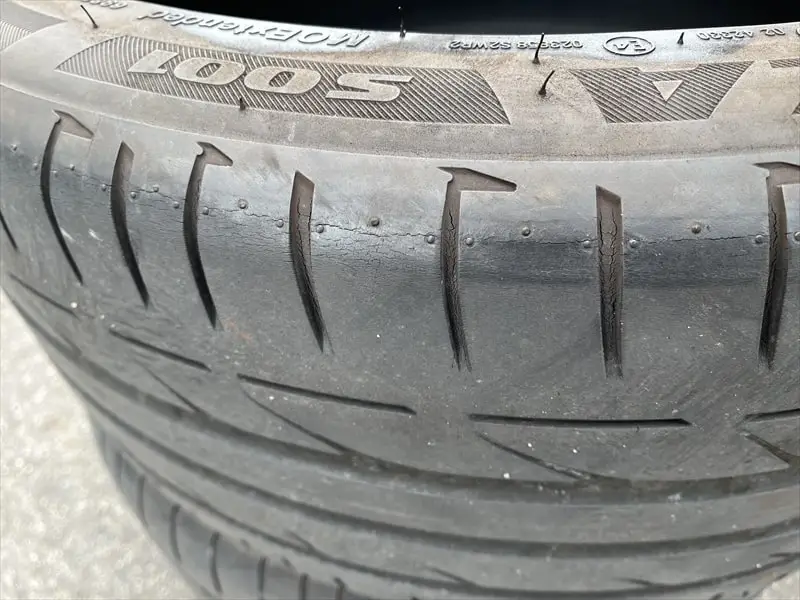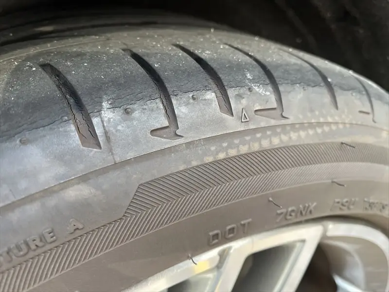 タイヤの残り溝はリアタイヤが3.5ミリでしたから溝の深さからしますとまだ使用できそうなのですが、リアタイヤは製造年から5年を経過していますので見ますと細かいひび割れがトレッド部などに多くなってきました。