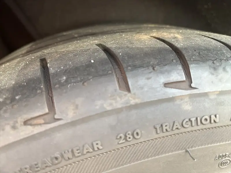 タイヤをぱっと見ますと割れ目はあまり分からないのですが、スマホで写真を撮ってみますと拡大されてとても良くわかります。