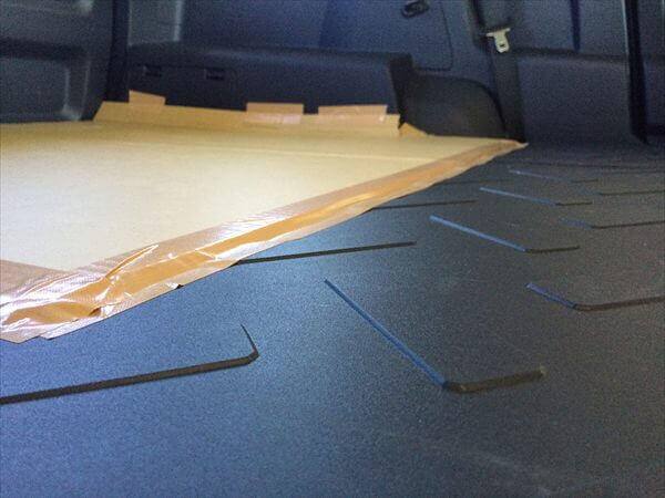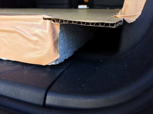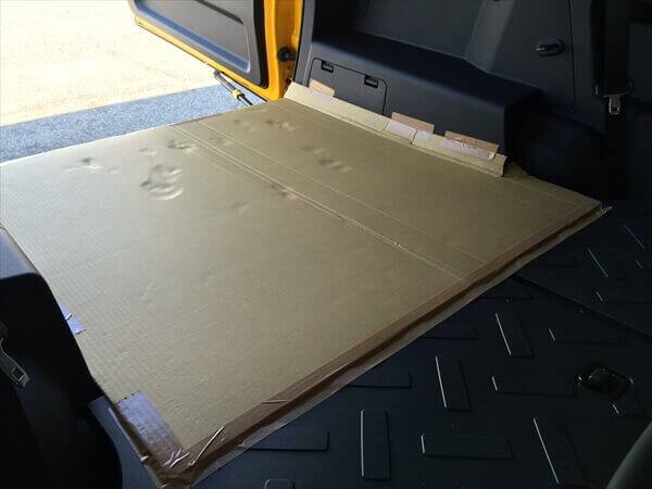 若干荷室と倒した背面には段差があり、荷室の方が低くなっていますので、こちらには丁度良い寸法にカットした発泡スチロールを敷いて、その上から段ボール紙を一枚敷きます。