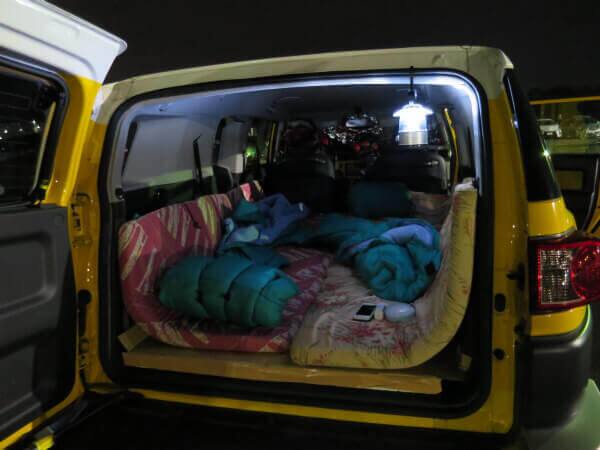 実際にFJクルーザーで車中泊した時の写真はこちらです。