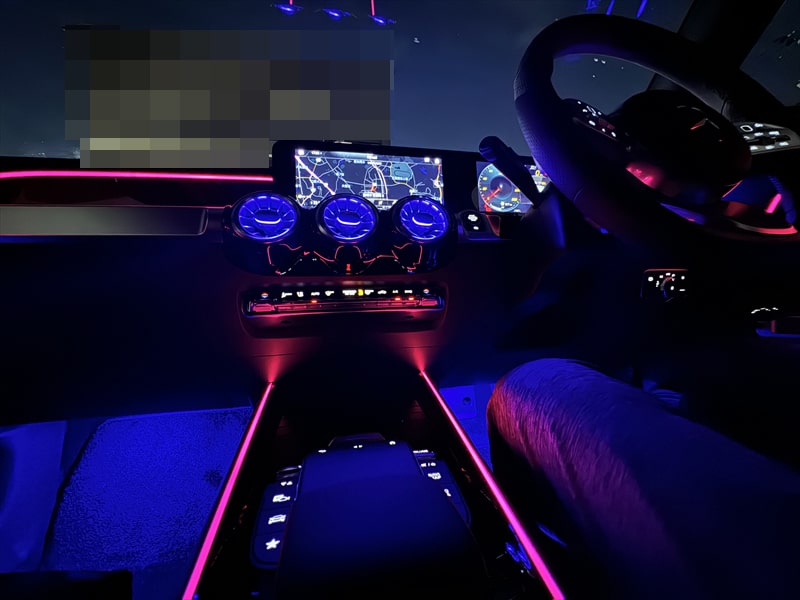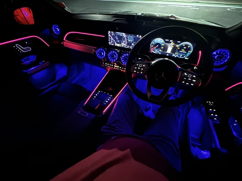 GLB180にはマルチカラ―アンビエントライトは64色なのだそうですが、夜は車内がとても賑やかです。