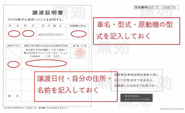 譲渡証明書の車名、型式、原動機の型式、譲渡年月日、譲受人の氏名と住所