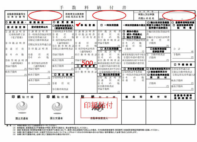 手数料納付書にも「自動車登録番号」、「所有者(自分)の氏名」、「申請人(自分)の氏名と連絡先の電話番号」を記入します。