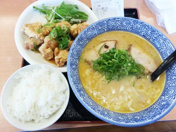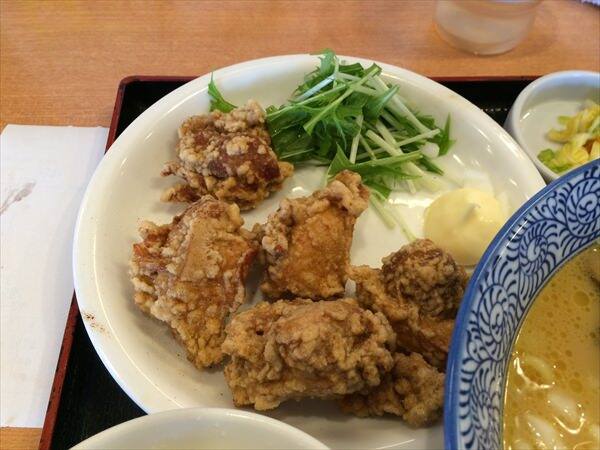麺の蔵我天ではランチ時間にはご飯がサービスされるのですが、私はお得なセットとなるからあげや餃子を追加します。