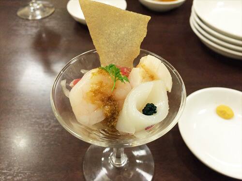 次に運ばれてきたものはカクテルグラスに盛られた海の幸の前采です。