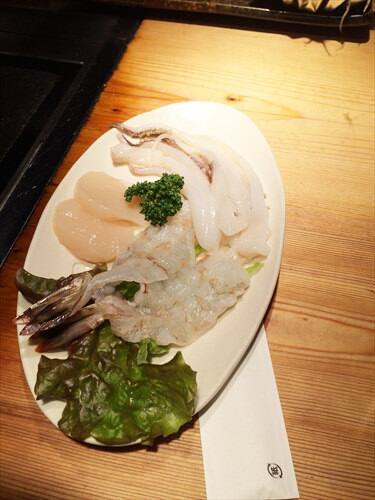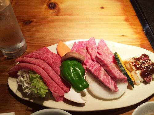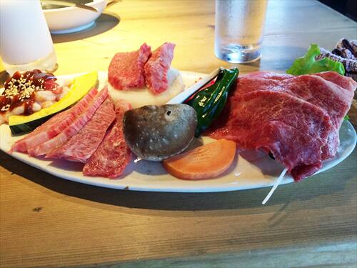 焼肉の内容は特選ロース、上ロースカルビ、ねぎ塩ロースで、海の幸と焼野菜が付きます。