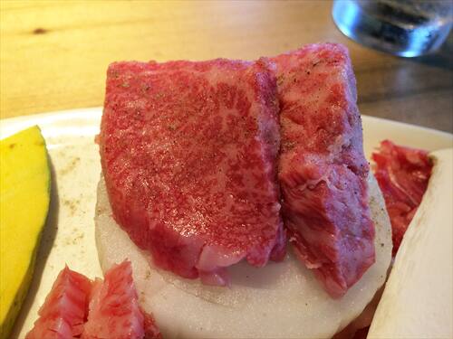 知多牛には塩と胡椒がかけられていますので、軽く焼きましたらそのまま食べるのが肉の味がよくわかるのでお勧めです。