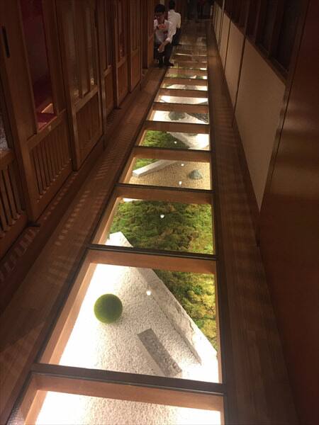 通路はガラス製で廊下の下の日本的な庭の造作を楽しむことができます。