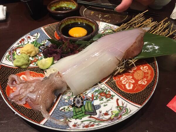 料理は熊本名物からし蓮根や有村屋のさつま揚げ、博多うまだれキャベツ、マテ貝バター、呼子の剣先烏賊刺しなどを頂きましたが、呼子の剣先烏賊刺しがとても新鮮で美味しかったのです。