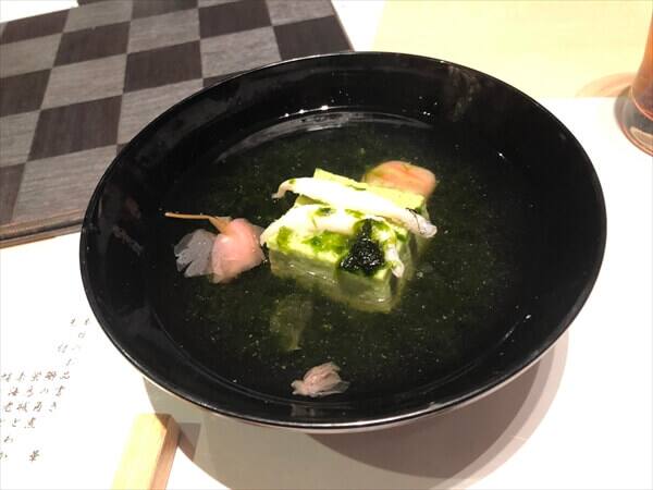 鶯豆富(うぐいすとうふ)と子持ち白魚の青海苔椀