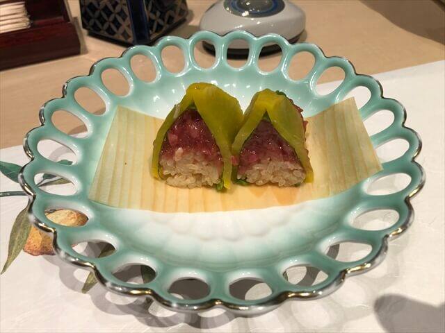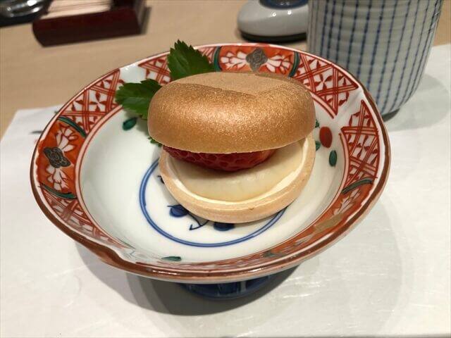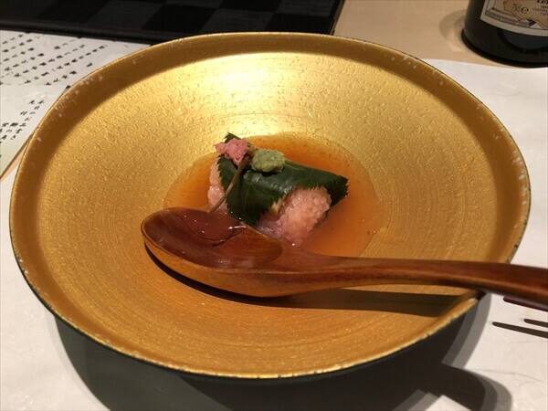 桜の葉の塩漬けによる春らしい一品でした。