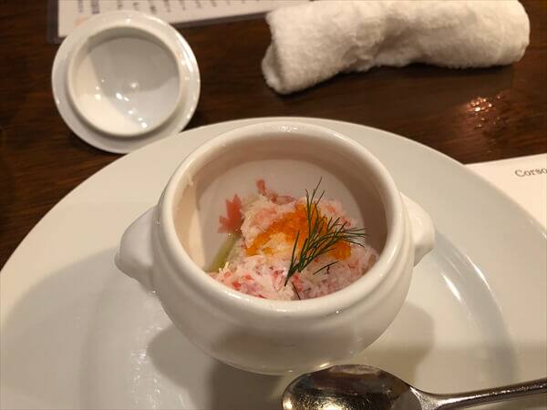 こちらはずわいがにの蟹ミソのプリンの上に身がのっていて、蟹を美味しく頂きました。