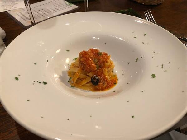 パスタはアンチョビ、黒オリーブ、ケッパー、パセリが入ったピリ辛のトマトソースが使われます。