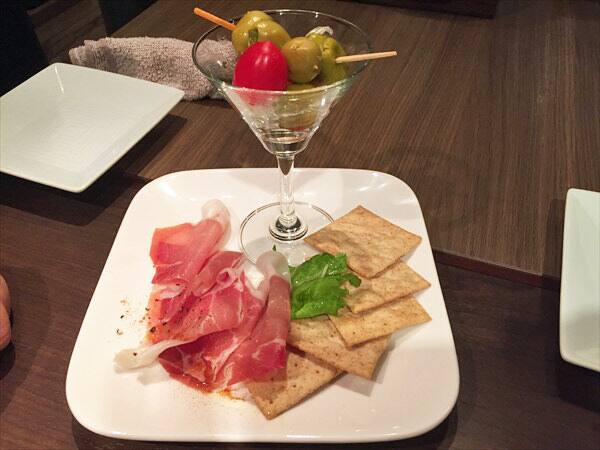 赤ワインのフルボディにしましたので出されたのが生ハムとオリーブです。