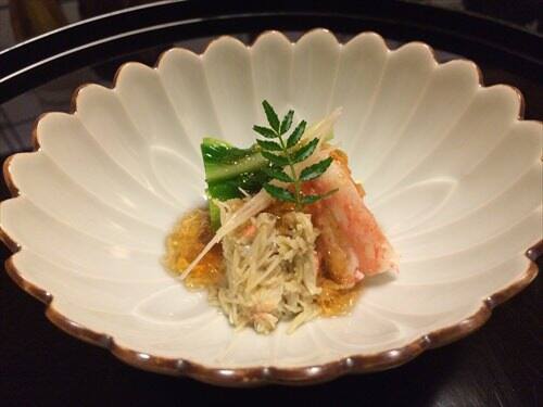先付 図合蟹 うるい 蟹酢ジュレ 針生姜 木の芽