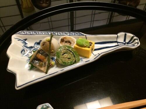 前菜 小槍烏賊土筆寿司 鯛香梅煮 こごみ胡麻和え 天豆