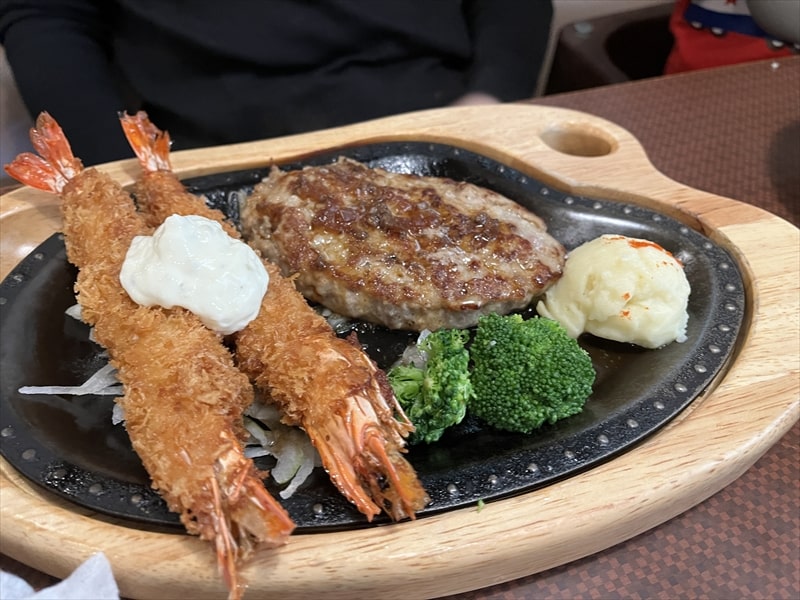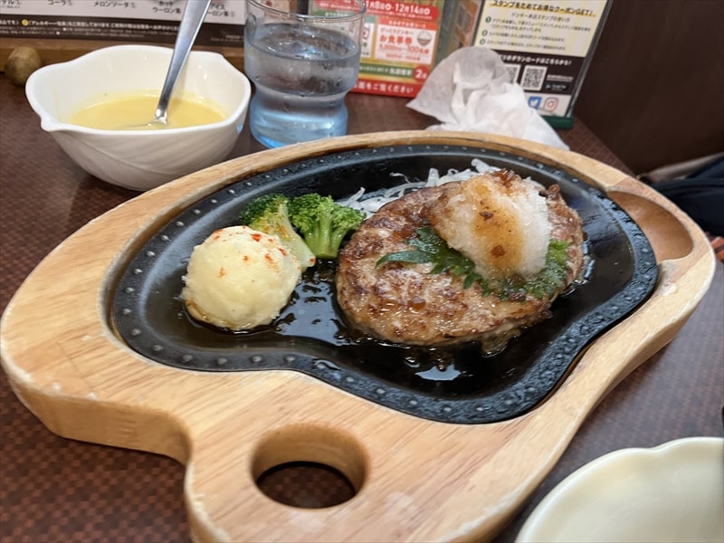 ちなみに大人が頼んだのはおろしそバーグステーキ200グラムとコーンスープ、びっくりエビフライ&ハンバーグステーキ150グラム、レギュラーバーグディッシュ150グラムとドンキークラッシクサラダのLサイズです。