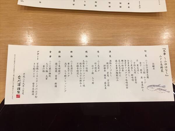 今回は旬のふぐと冬野菜を使った冬季限定の特別コースの冬華~ふゆはなを頂きました。