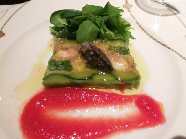 オードヴルはオマール海老と夏野菜のテリーヌ トマトのクーリー添えで、これはワインがすすみます。