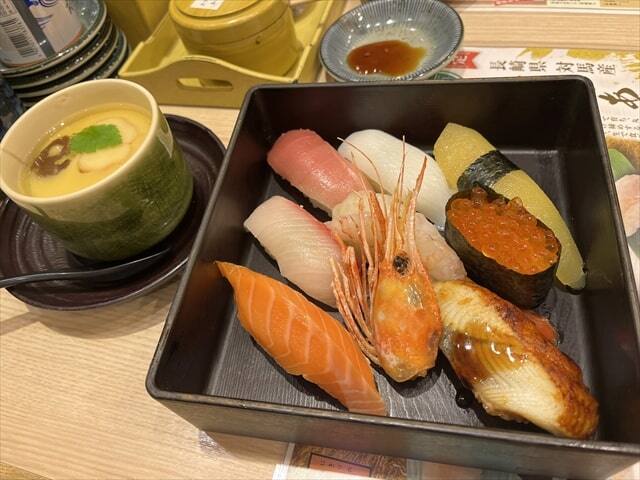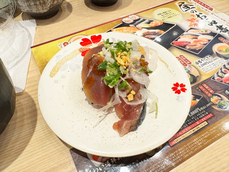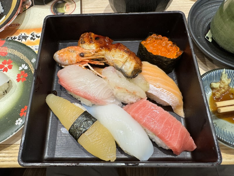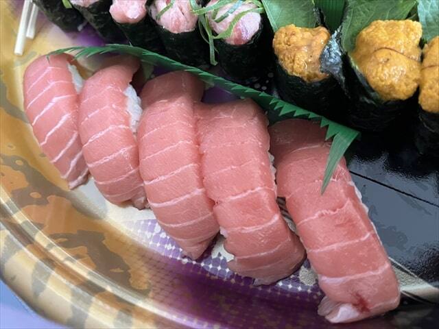 ネタは中トロ、かんぱち、まぐろ、トロサーモン、えんがわ、いか、赤海老、ネギトロ軍艦、生雲丹軍艦、真鯛となっていました。