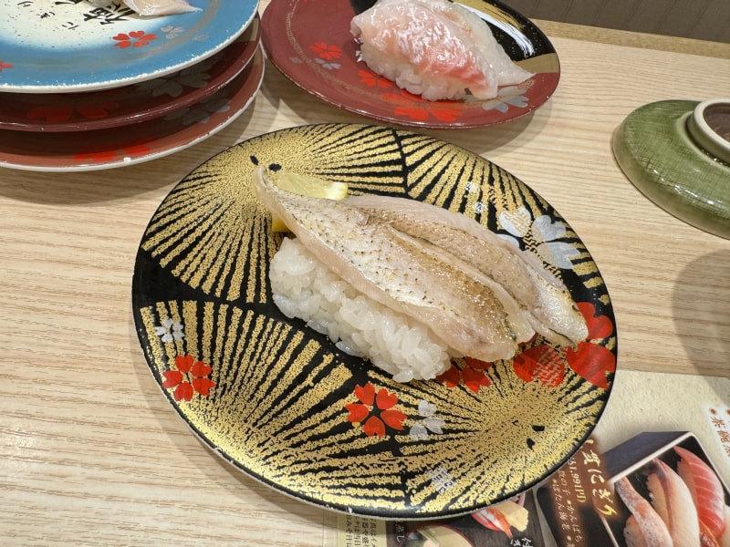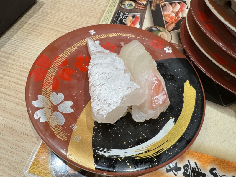 本まぐろ大とろ、真鯛、甲いか、のどぐろ炙り、赤貝を注文しますとすぐにレーンで運ばれてきましたので、ランチが来るまではこれらを食べていました。