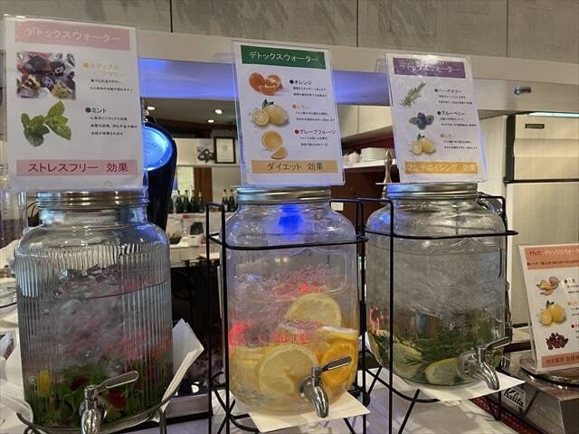 席に案内されましたが、水はセルフサービスで自分の好きなデトックスウォーターを紙コップで取に行きます。