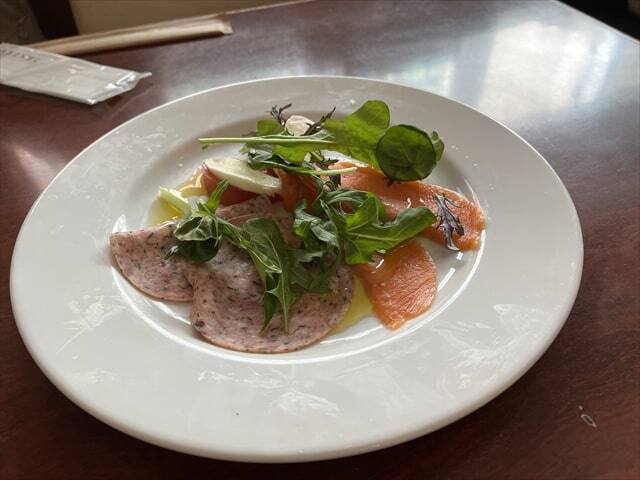 前菜盛り合わせはハムとスモークサーモンとカプレーゼでした。