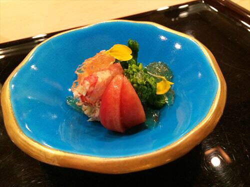まずは蟹の身とトマトのお通しからスタートです。