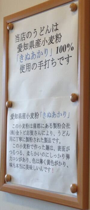 讃岐うどんの十四明は以前は香川県より仕入れた小麦粉を使用して、毎朝うどんを打っていたはずですが、今回お店の中には愛知産の小麦粉「きぬあかり」を使用しているとの表示がありました。