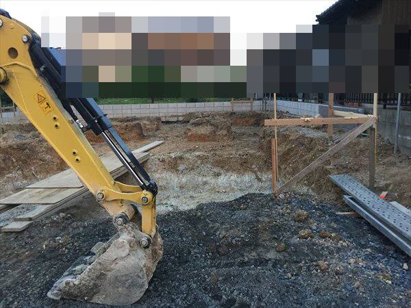 重機で基礎部分を掘り、掘った場所に捨てコンが打たれます。