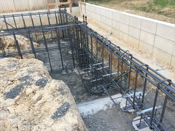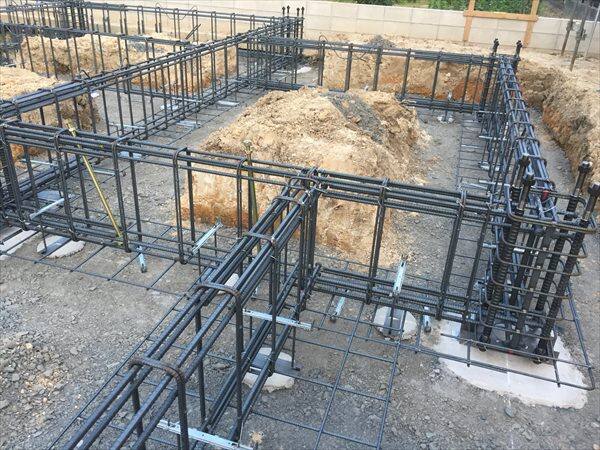 そこに成形されて現場で組み立てる状態の鉄筋が運び込まれ、基礎の鉄筋が出来上がります。