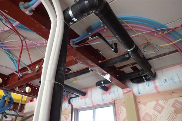今回建築途中で驚いたのが寝室の天井に上の階のキッチンの排水管が通っていたことです。