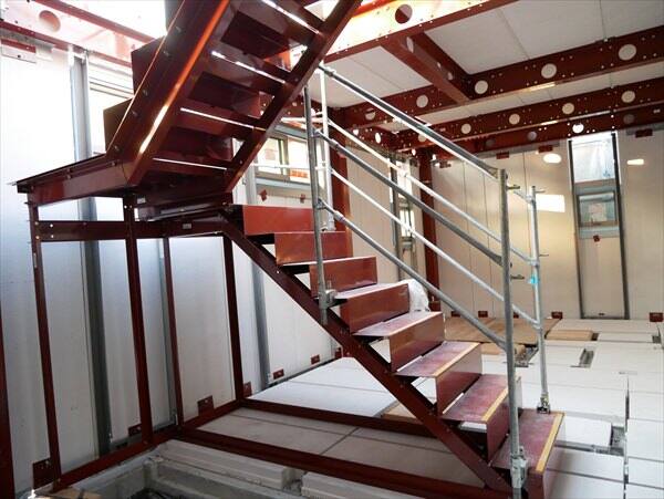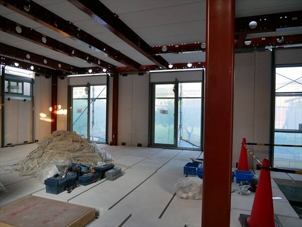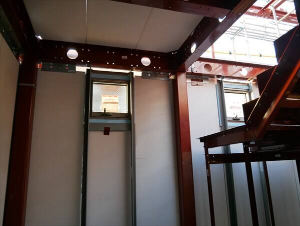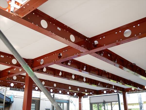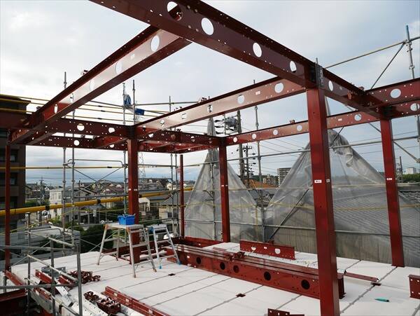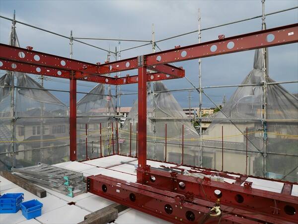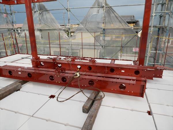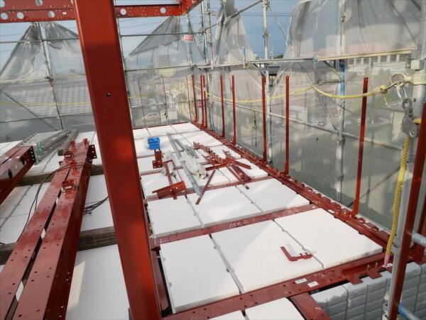 柱のコーナー部分以外は既に寸法が鉄骨に合わせて切断されていますので、梁の上に乗せていくだけです。