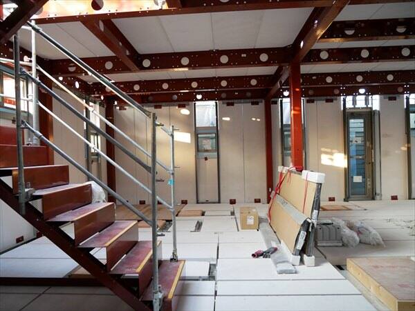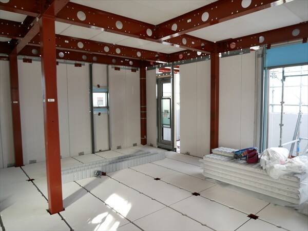 へーベルハウスの鉄骨工事が始まり、梁が取り付けられますと床のへーベルボードがどんどん敷かれていきます。