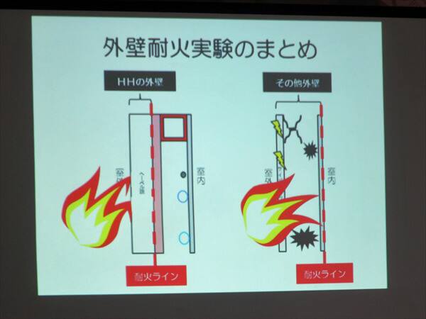 ヘーベルハウスは設計上でヘーベル壁のみで耐火としているが、他では外壁と断熱材、屋内材までで耐火の対応をしているとの説明がありました。