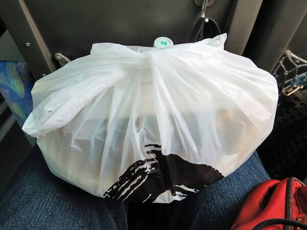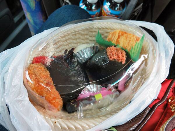1軒目の見学終了は11時頃となり、バスに戻りますと座席にお弁当のおにぎりが置いてありました。