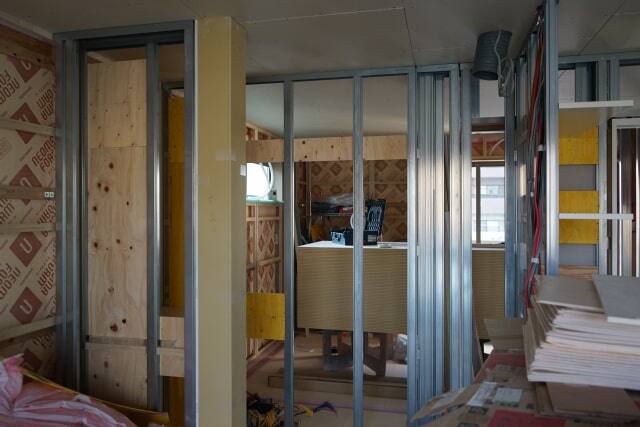このアルミのフレームに石膏ボードが貼られて壁になるのです。