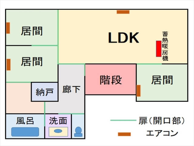 我が家の場合はリビングダイニングに置かれた蓄熱暖房機により、つながっている部屋の暖房はもちろんの事、短い廊下の先にある洗面所やトイレも暖かくなりますので、間取りによって寒くならないようになっています。