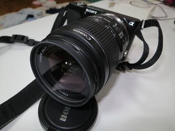我が家にはキャノンのイオスKissX6iのダブルレンズキットがありますので、使われていないキャノンのEFSレンズの18-55mm F3.5-5.6 ISを使えないかなと考えたわけです。