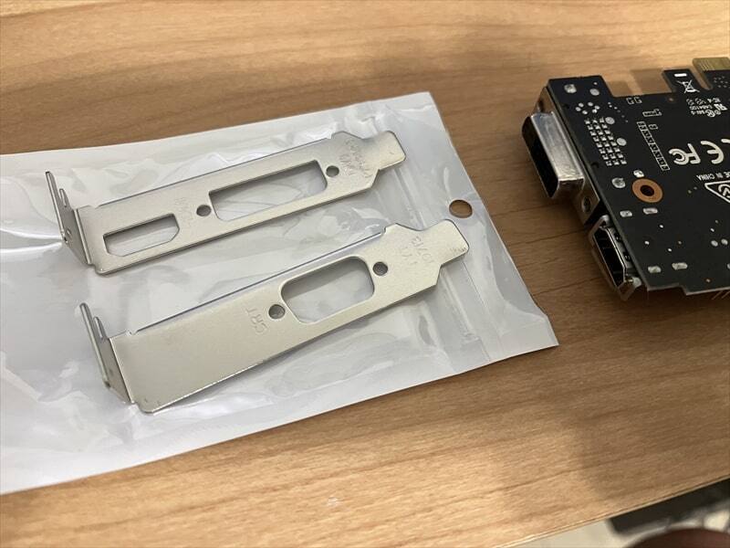 そこでVGAは外してグラボはケースに固定しないで使用しても良いかなと思ったのですが、HDMIのコードが引っ張られた時のことも考えて、HDMIとDVIのみのスリムタワー用のブラケットに交換して差しました。