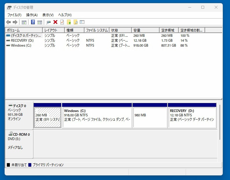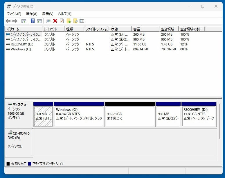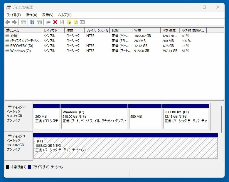 HDDは2TBを使用していましたので、WindowsCドライブ以外のデーターパーティションは他HDDに移動して、ディスクの管理を使用して未割り当てにしておきました。