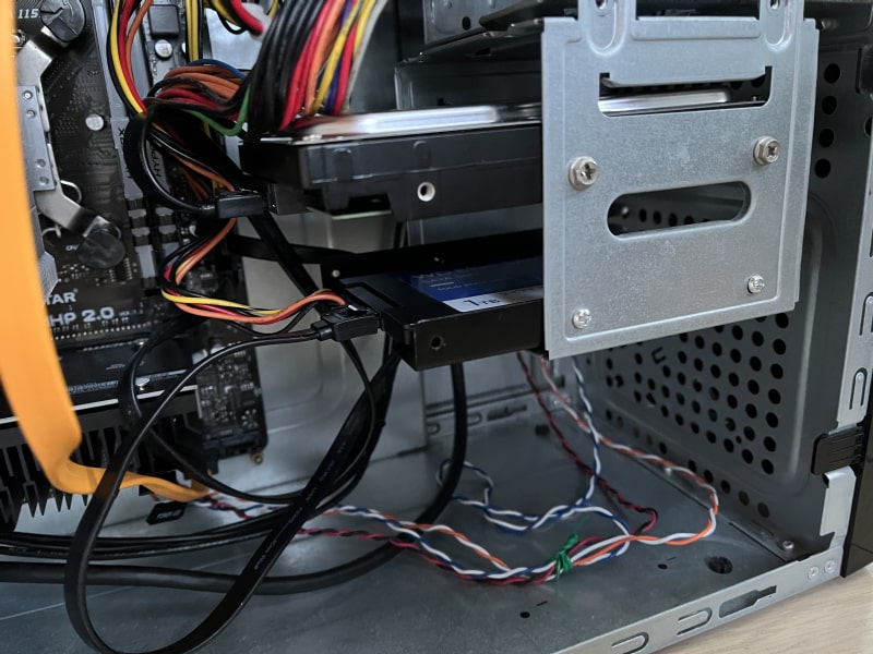 私の場合はデスクトップパソコンですから、購入したSSDを初期化も何もしないで余っている電源ケーブルと、シリアルATAケーブルでマザーボードに接続します。