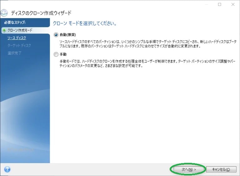 そうしますとディスクのクローン作製ウイザードの画面になりますので、クローンモードの選択は・自働(推奨)のまま「次へ」をクリックします。