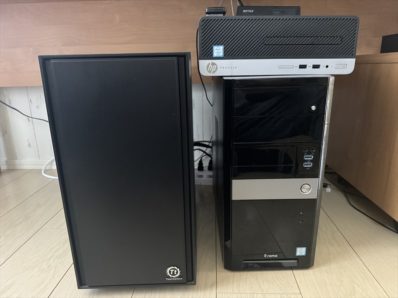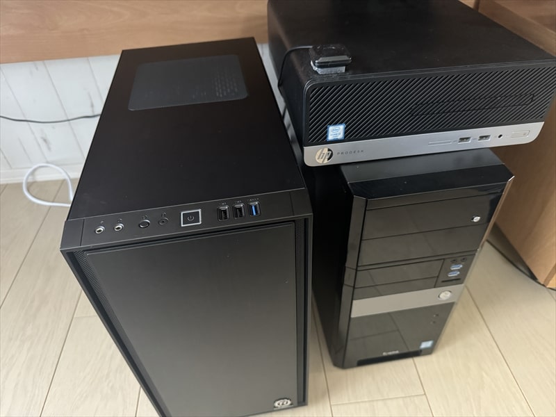 組みあがり後に使っているイイヤマのミニタワーPCとHPのプロデスクと比べて見ますとその大きさがわかります。