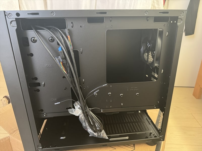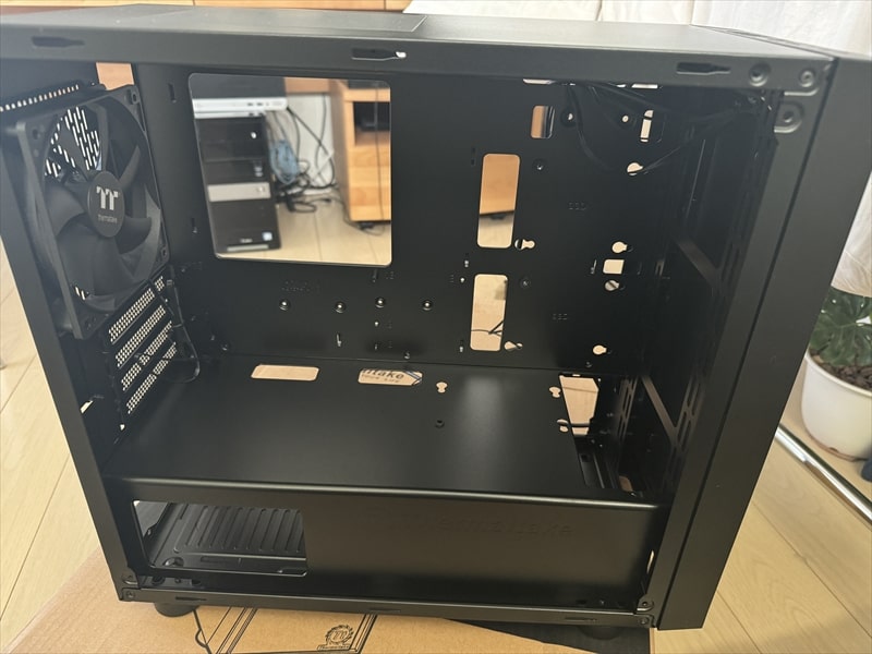 PCケースを開けますとMicroATXサイズのマザーボードを取り付けるにはかなり余裕がありましたので組み立てはとても簡単でした。