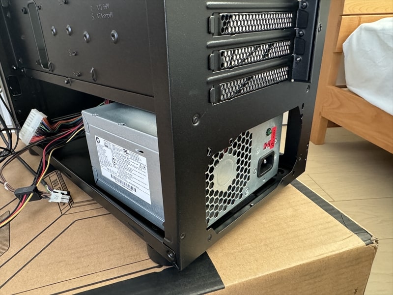 PCケースは電源付きのKEIAN KX-M01もどうかと悩んだのですが、価格が6,656円とそれなりの価格となっていましたので、今回は使っていたPCの電源を取り外して使う事にしました。